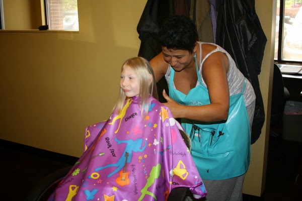 She promptly walked to the chair when it was her turn, and she didn't even get nervous when the big purple cape was placed over her.
